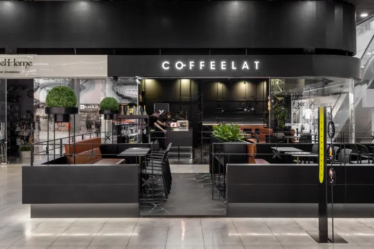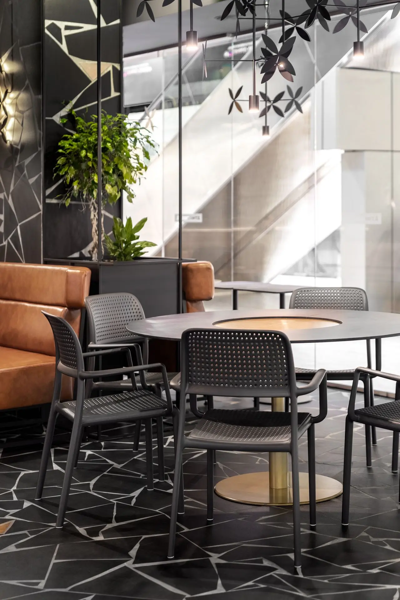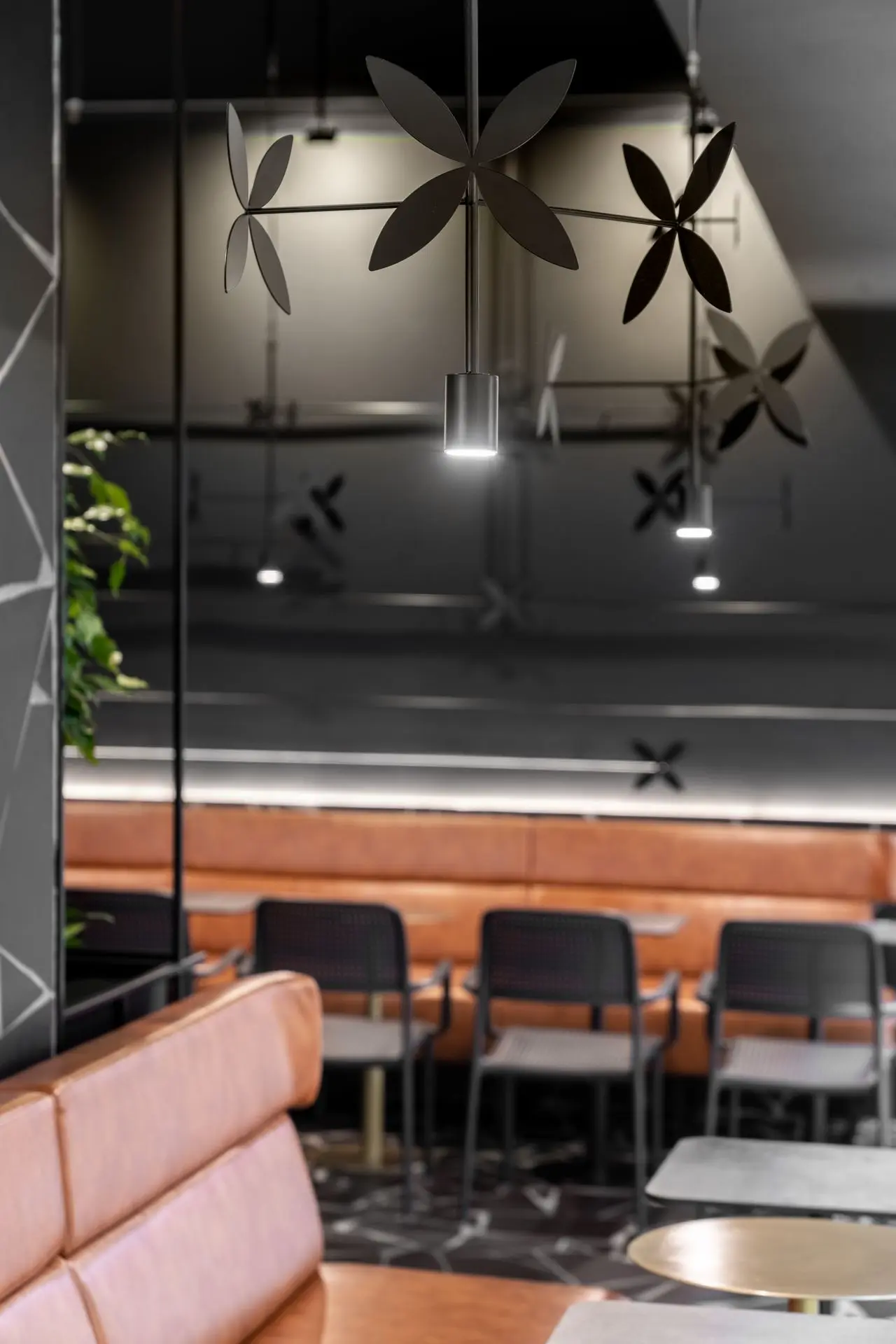 Un café con atmósfera, saturado de aromas e imágenes del café. Grafito, latón y cuero: un conjunto infalible.