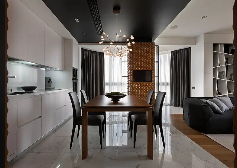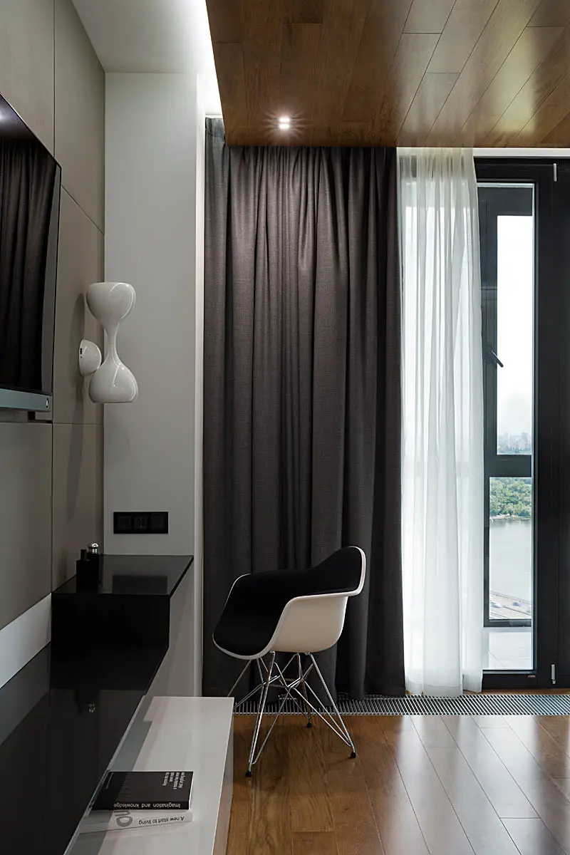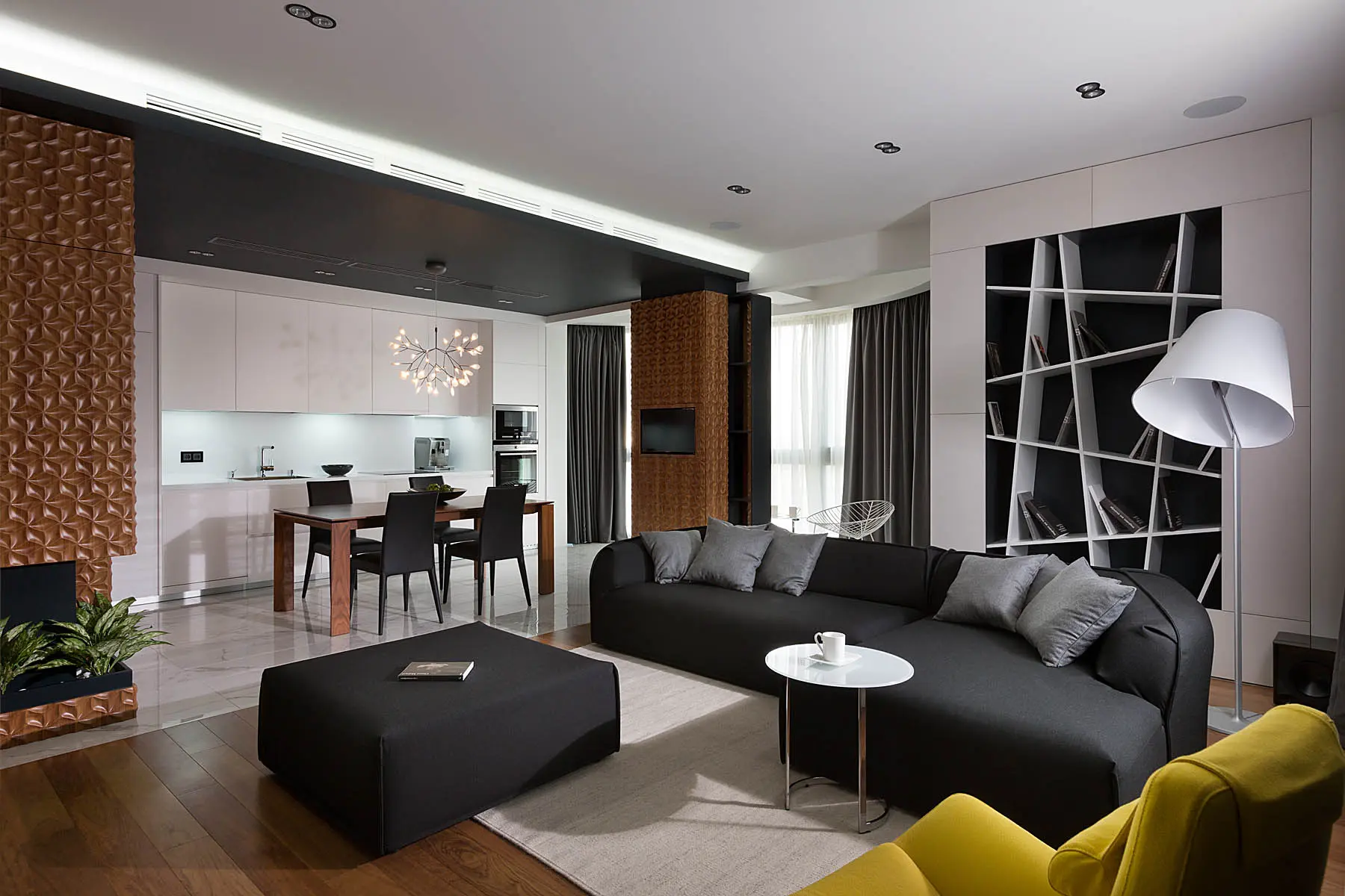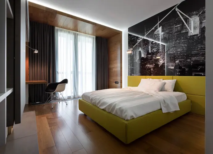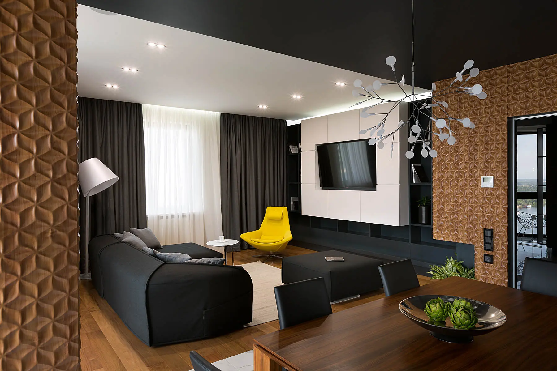 Apartamentos lacónicos y originales, diseñados con una paleta de colores sobria y estricta, realzada con acentos de color vibrantes