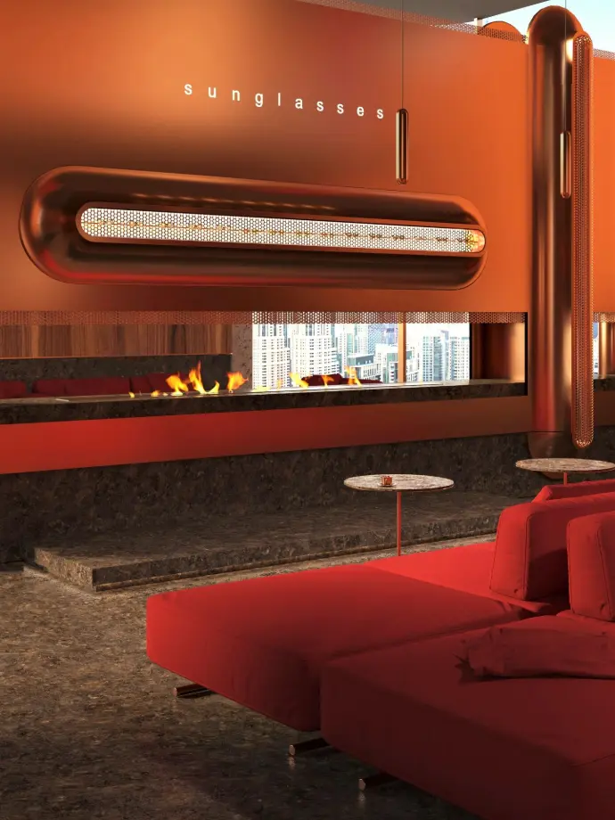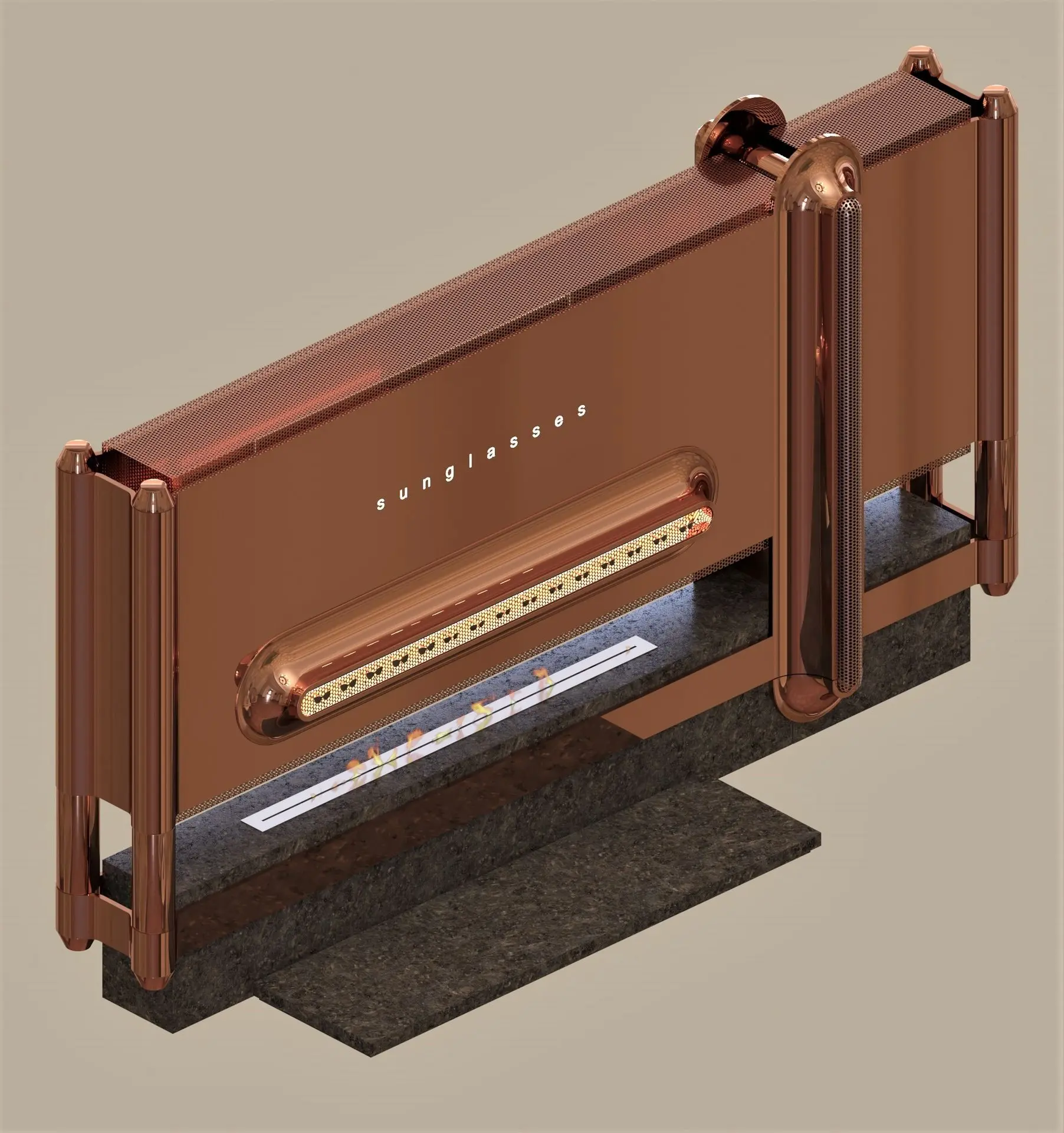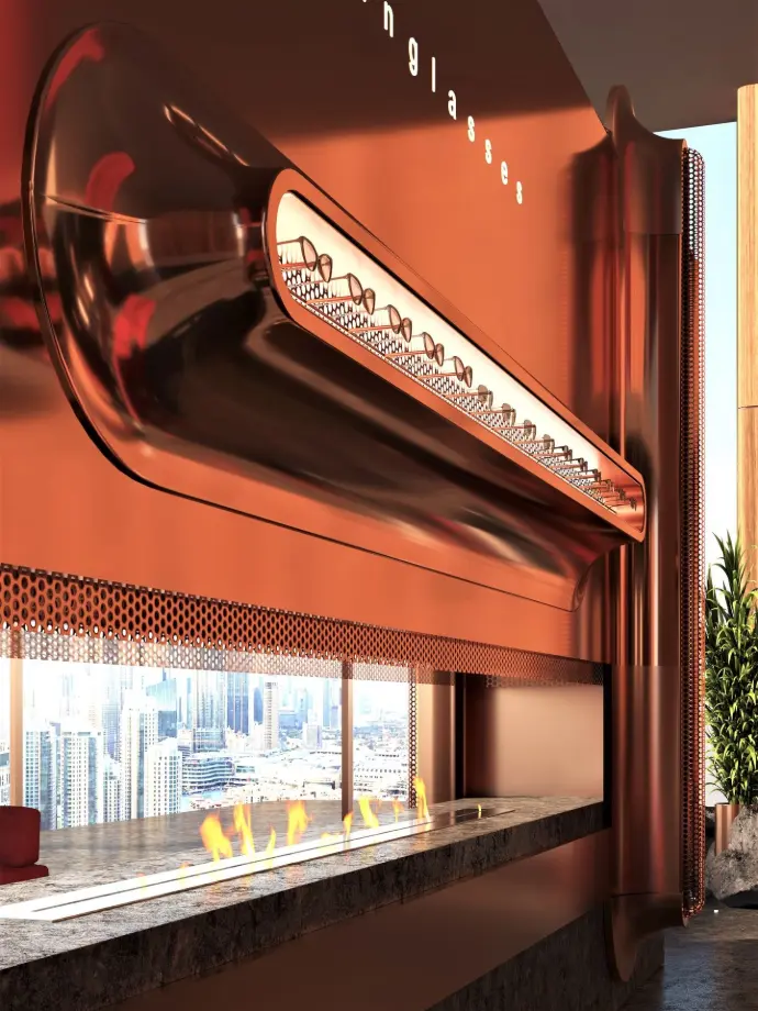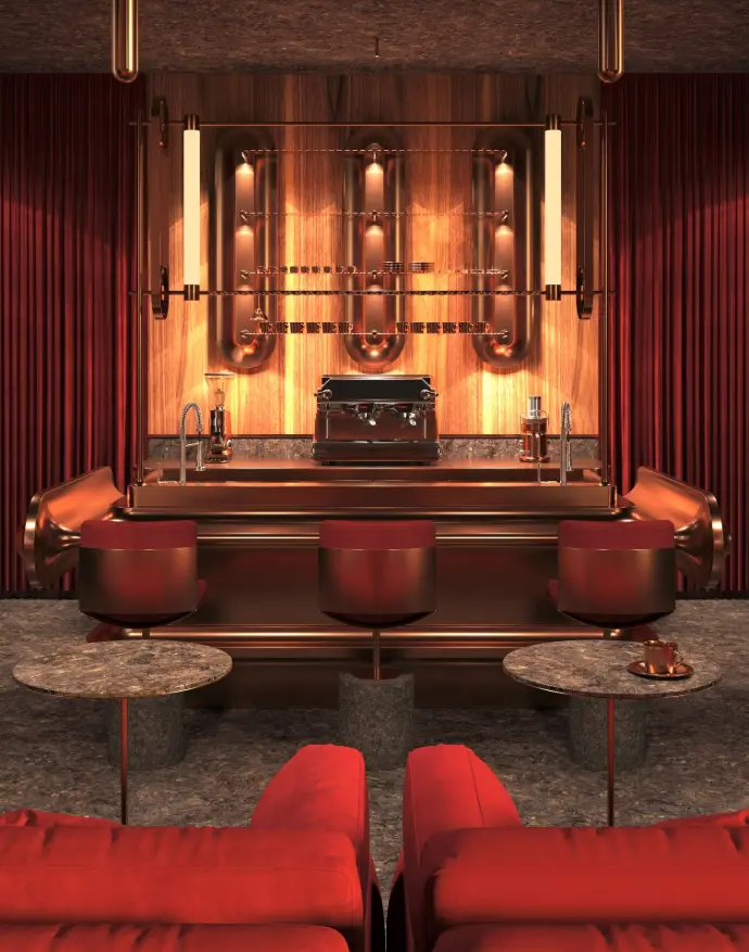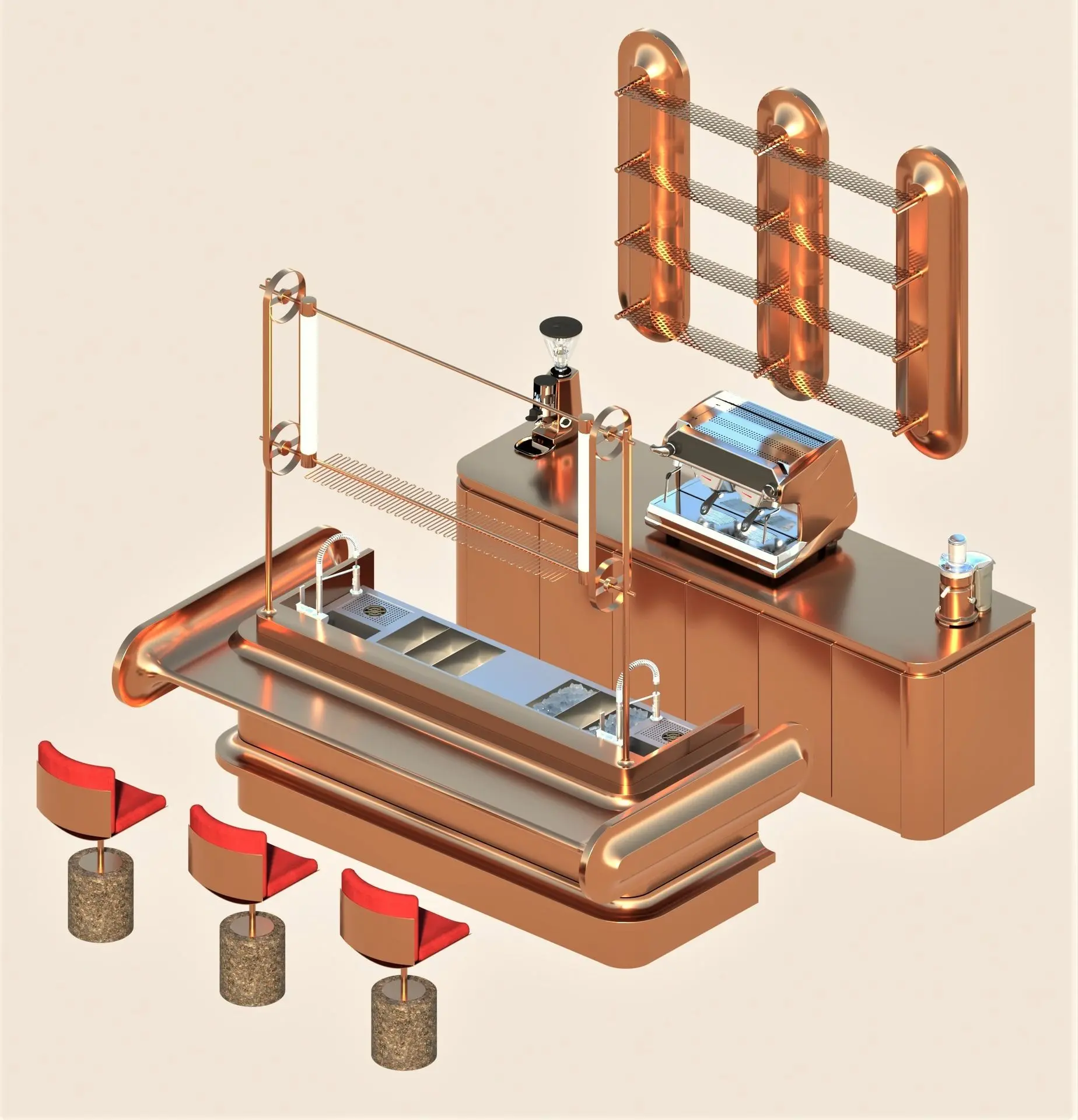 En el corazón de nuestra tienda se encuentra una impresionante chimenea retrofuturista de cobre, cuyo diseño audaz y fuera de este mundo te invita a un mundo de innovación. La barra de café refleja su elegancia escultórica, combinando una estética futurista con formas orgánicas para crear una obra maestra del diseño.