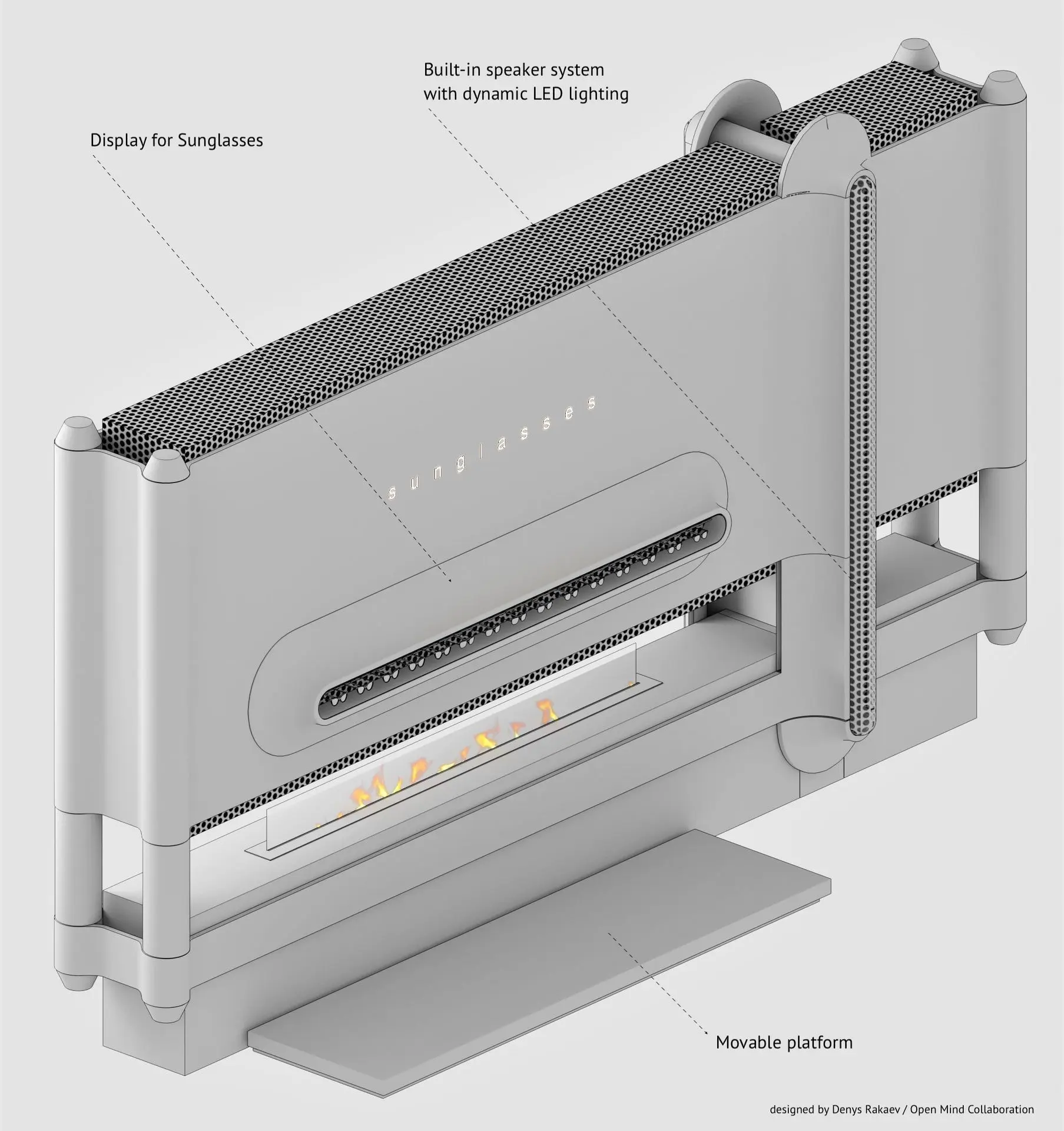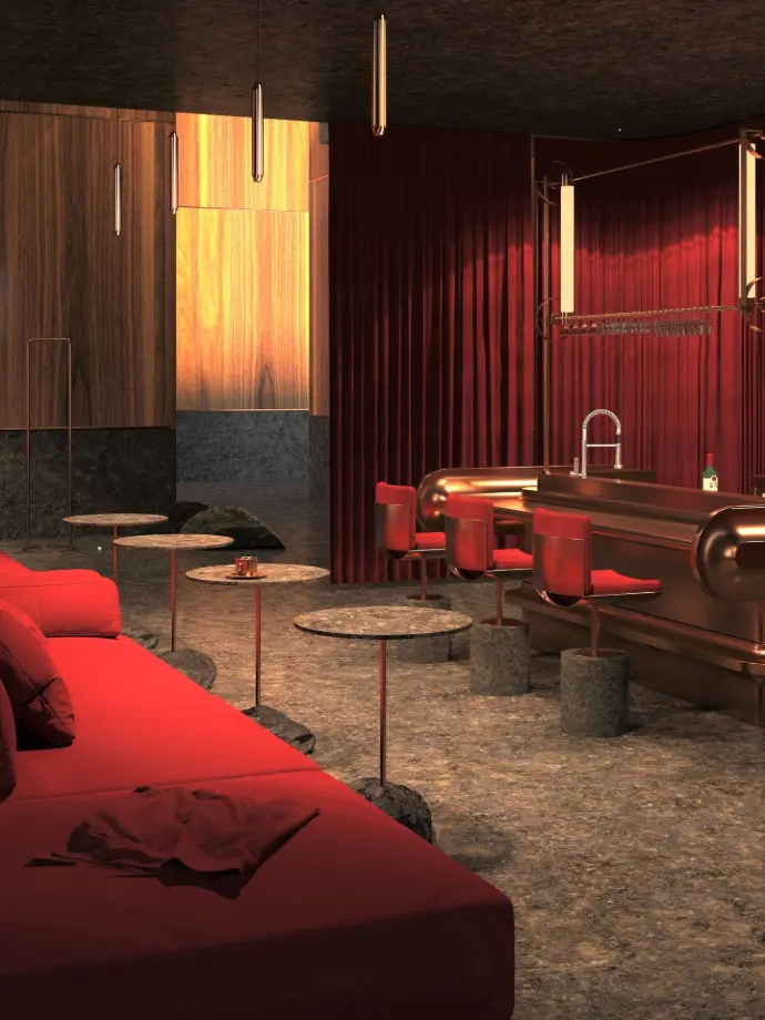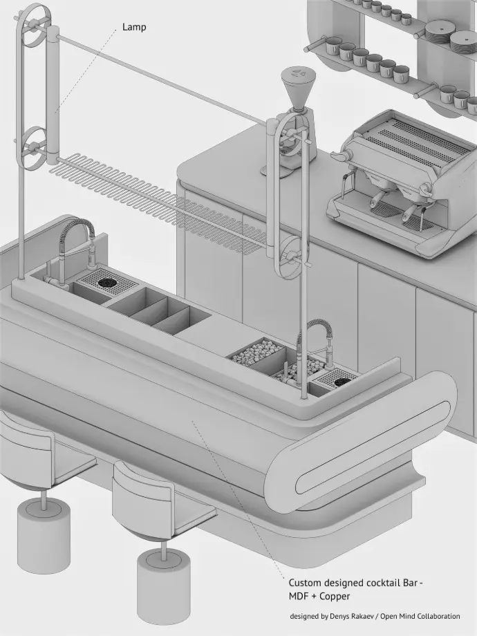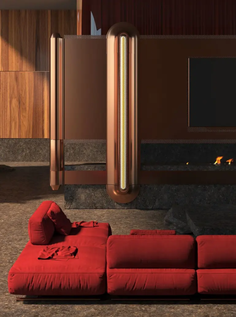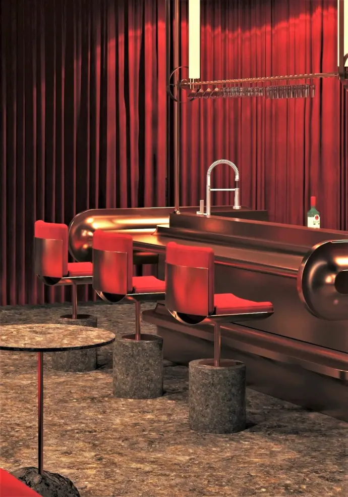 En el corazón de nuestra tienda se encuentra una impresionante chimenea retrofuturista de cobre, cuyo diseño audaz y fuera de este mundo te invita a un mundo de innovación. La barra de café refleja su elegancia escultórica, combinando una estética futurista con formas orgánicas para crear una obra maestra del diseño.