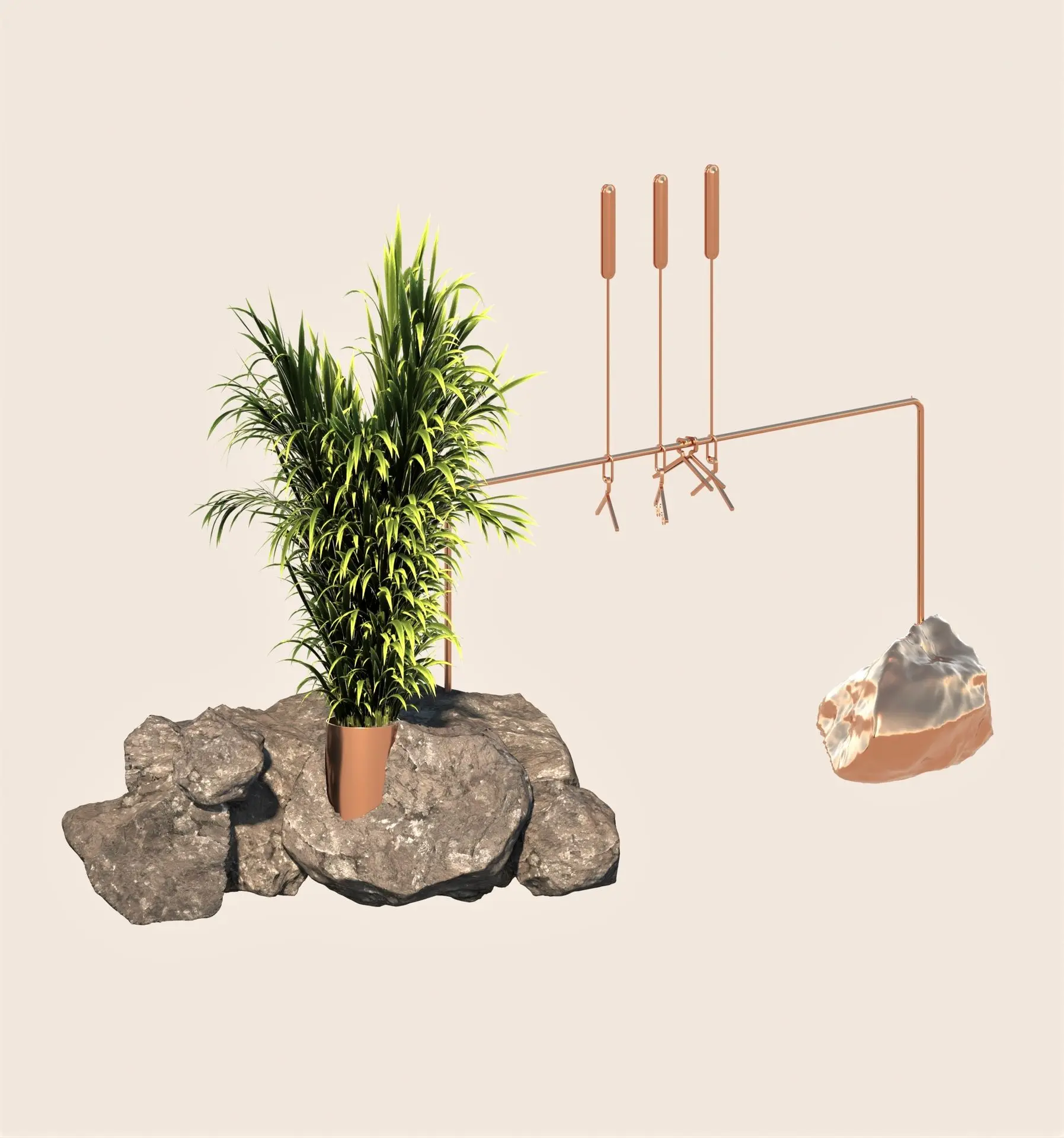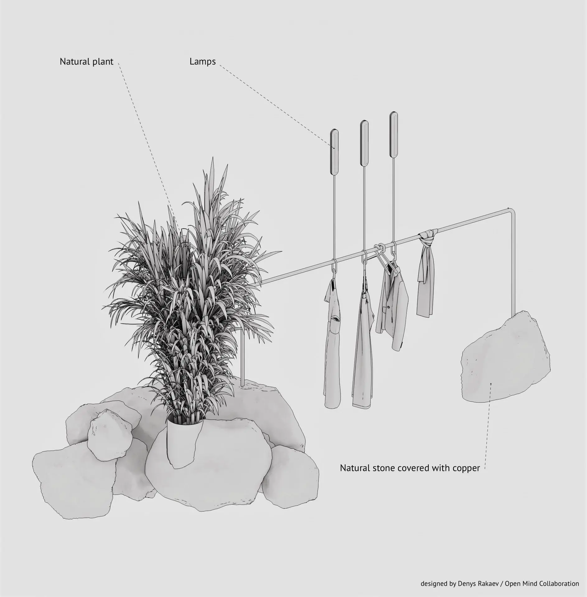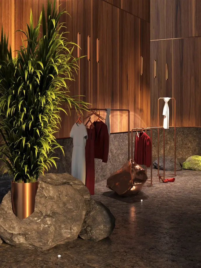 Formaciones rocosas irregulares y exuberante vegetación se entrelazan con elegantes percheros de cobre, creando un equilibrio armonioso entre la belleza natural y el diseño vanguardista. Este no es solo un espacio comercial, sino una declaración de la conexión perfecta entre la tecnología y la naturaleza..