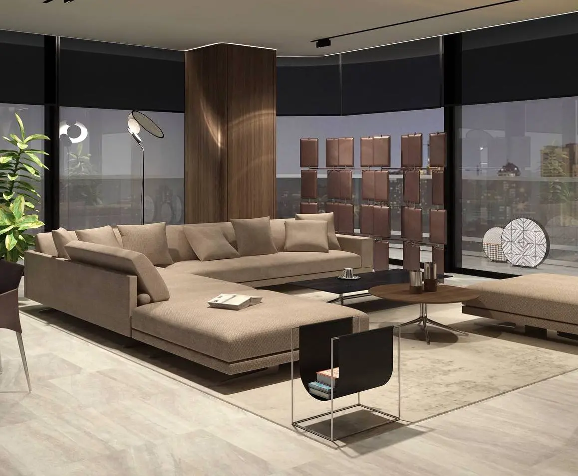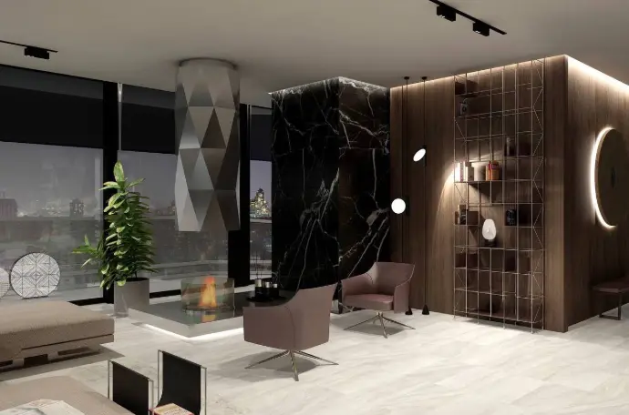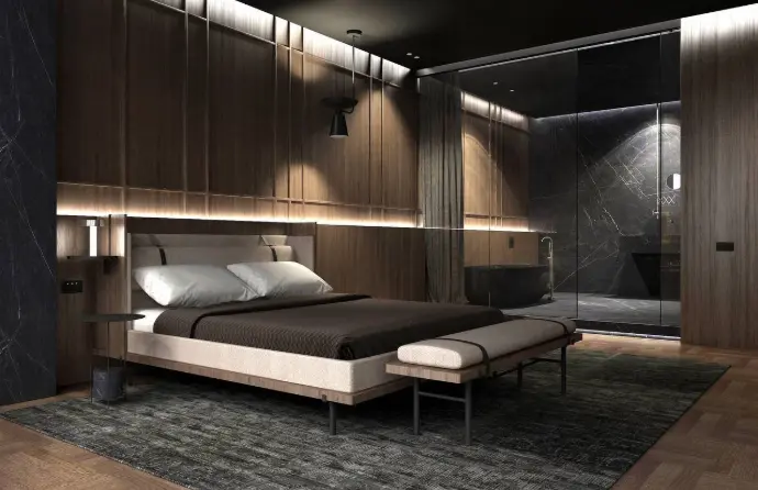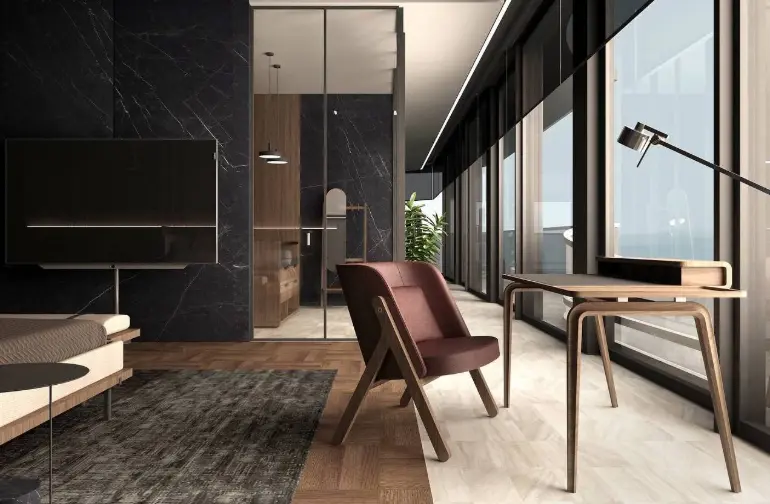 Apartamentos privados Signature con vista a la ciudad. Combinación de roble oscuro tintado y travertino, líneas lacónicas del mobiliario Poliform. Texturas naturales y cálidas, luz suave. Todo lo que necesita para una vida confortable.