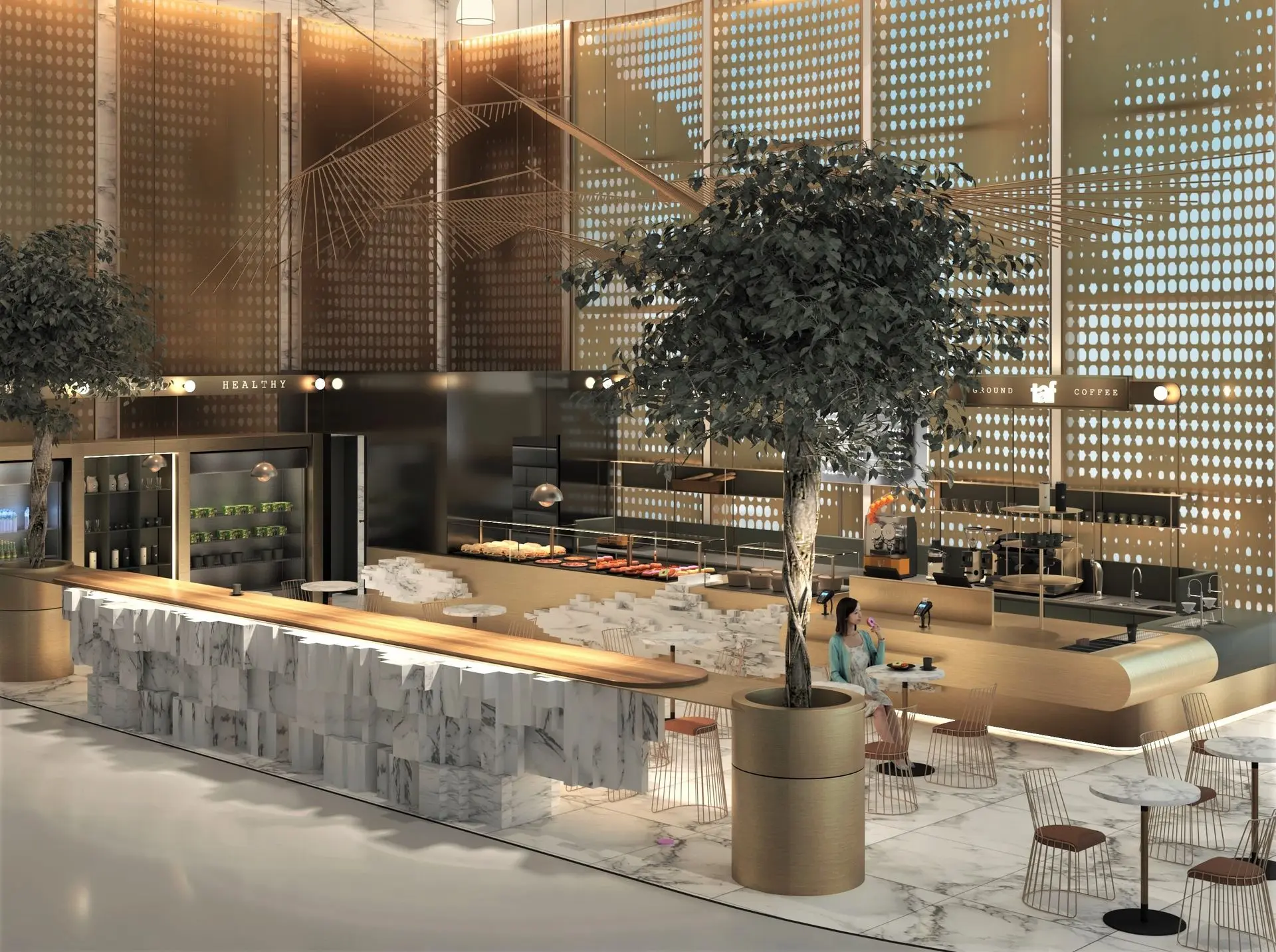 Un café con ambiente, impregnado de aromas e imágenes del café. Grafito, latón y cuero: una combinación perfecta.