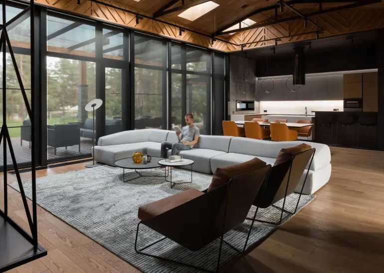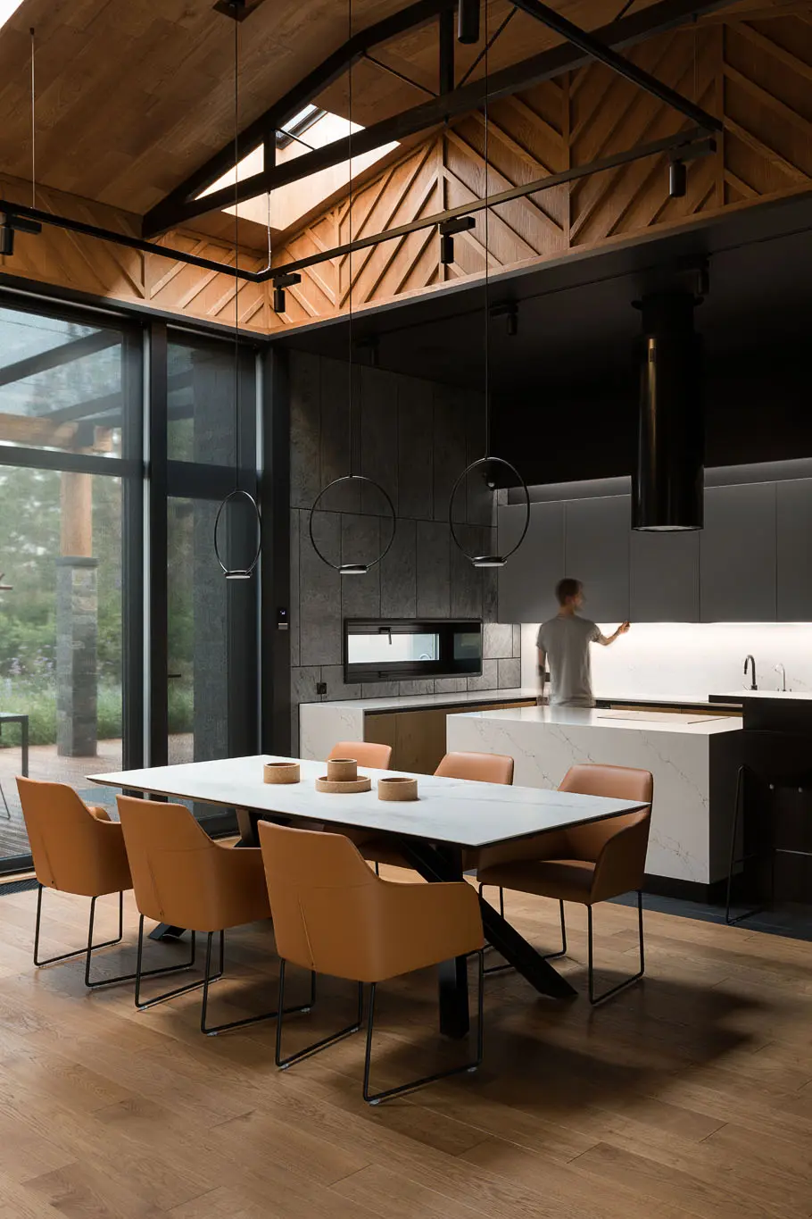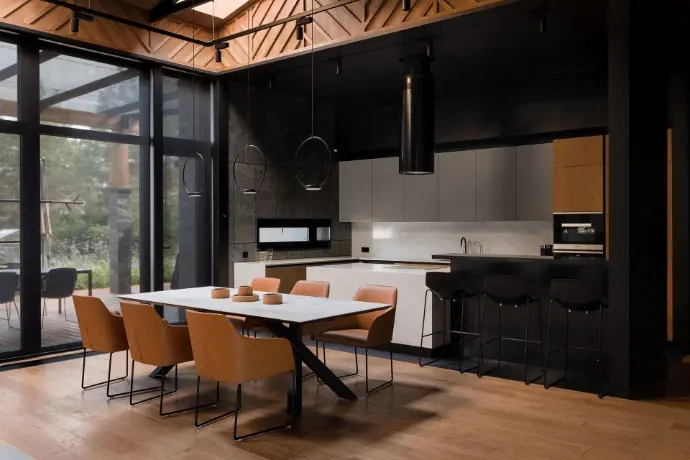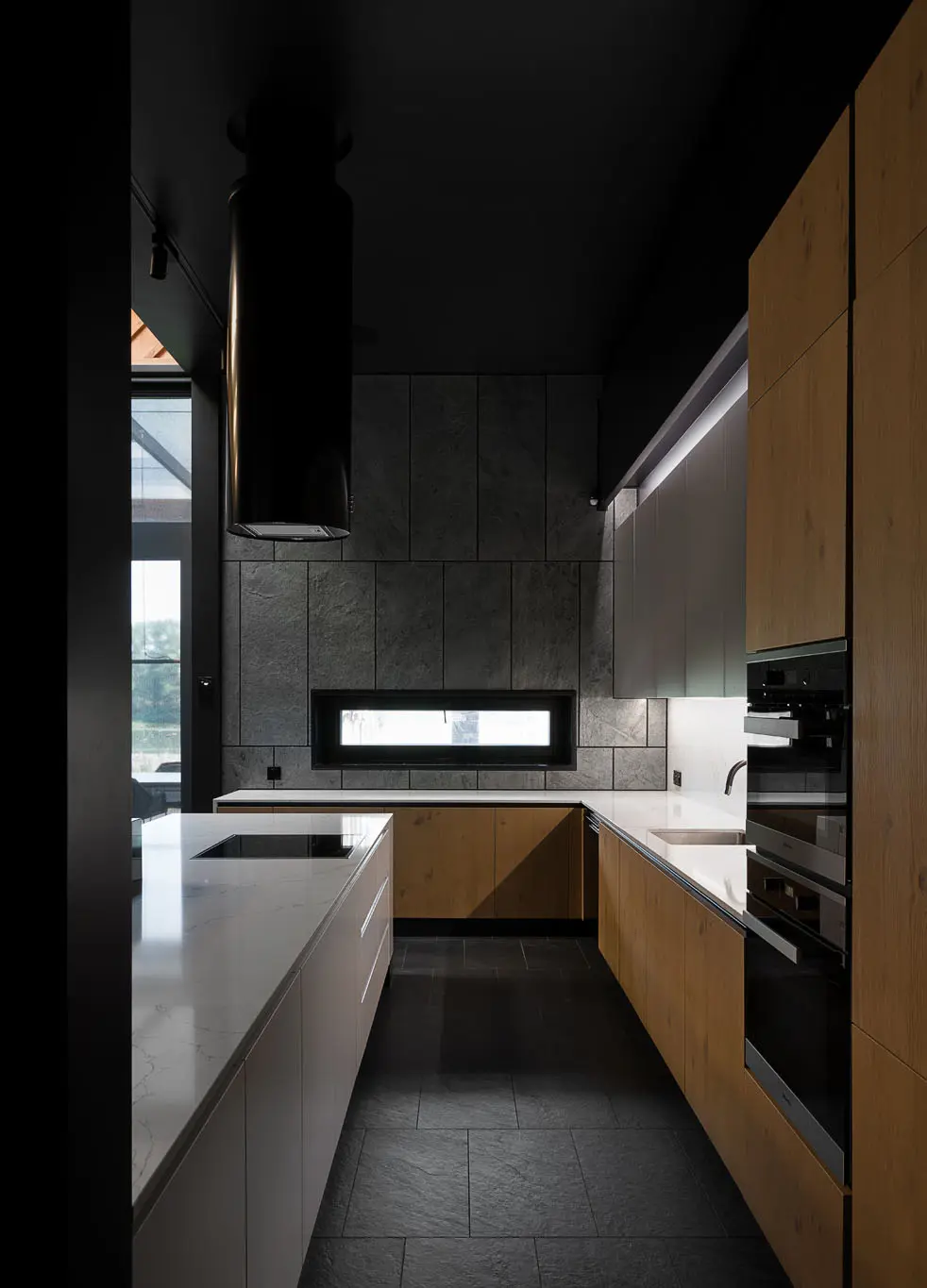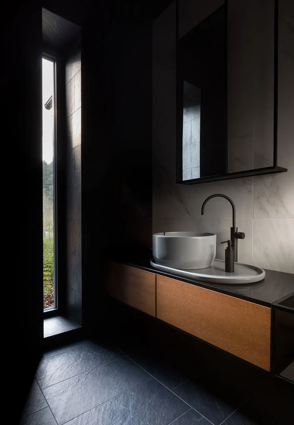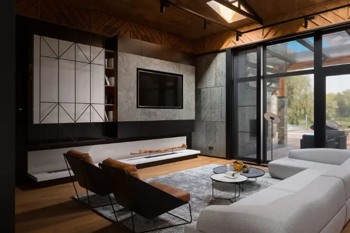 Villa privada de una sola planta en medio del bosque. Pizarra natural, roble y tonos de grafito entrelazados en este interior