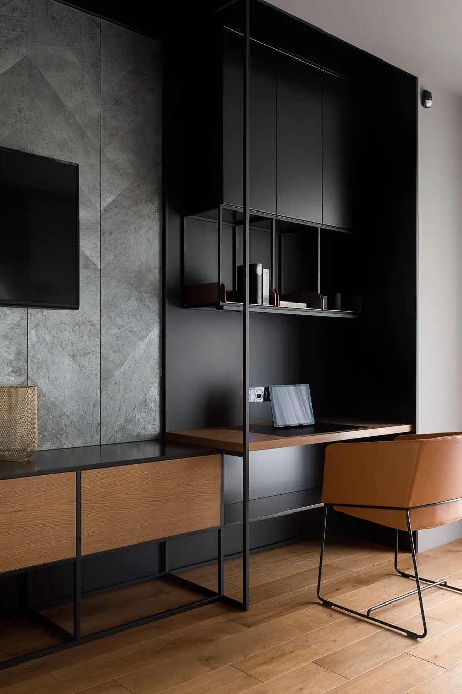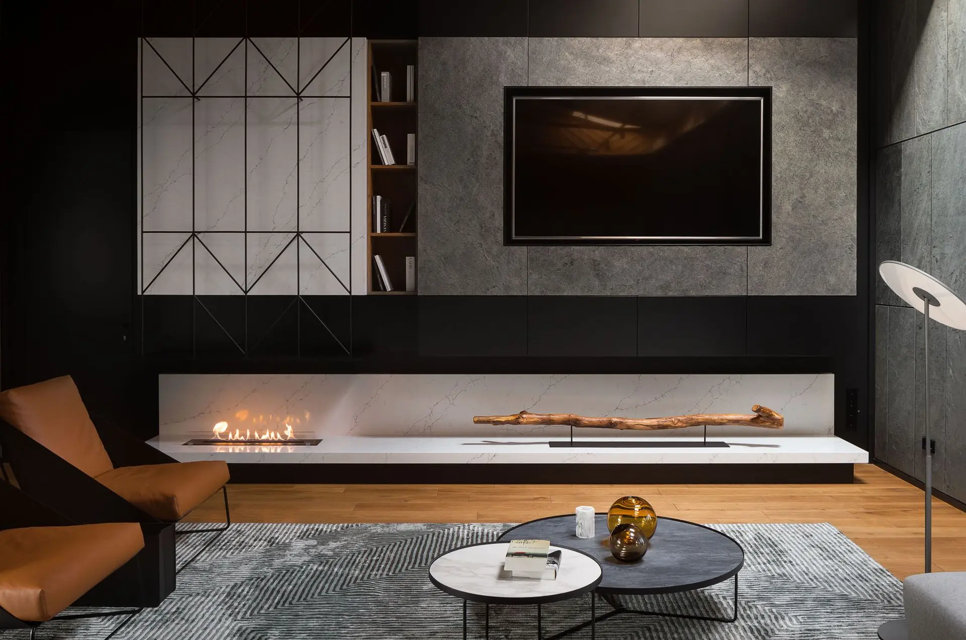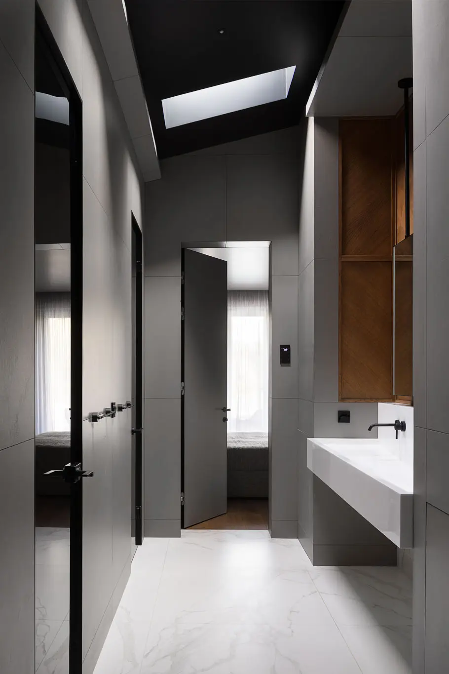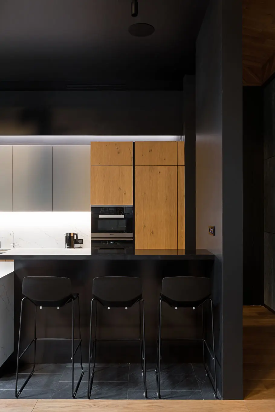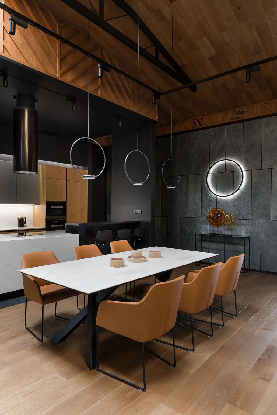 Villa privada de una sola planta en medio del bosque. Pizarra natural, roble y tonos de grafito entrelazados en este interior