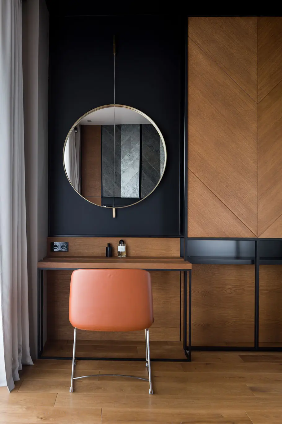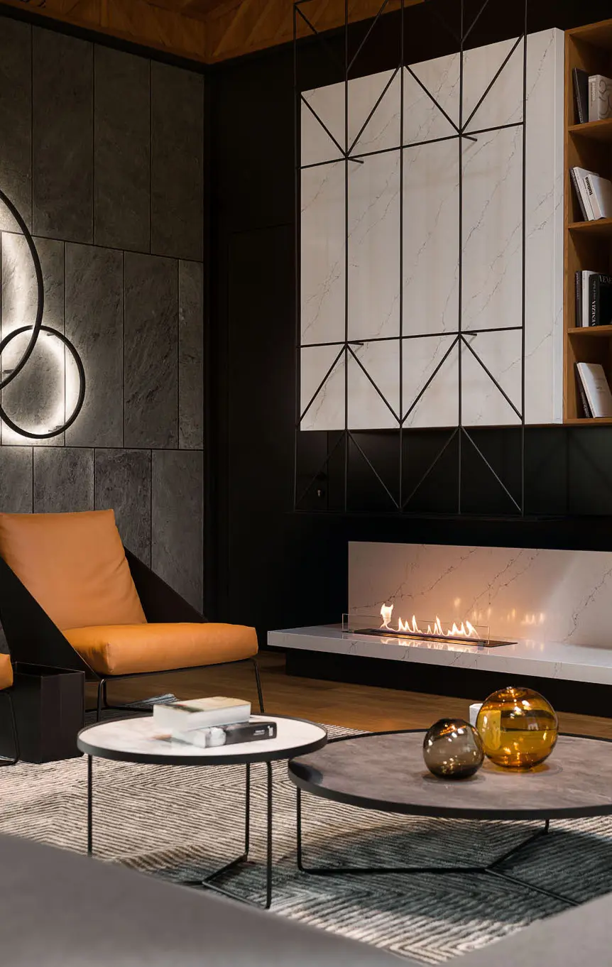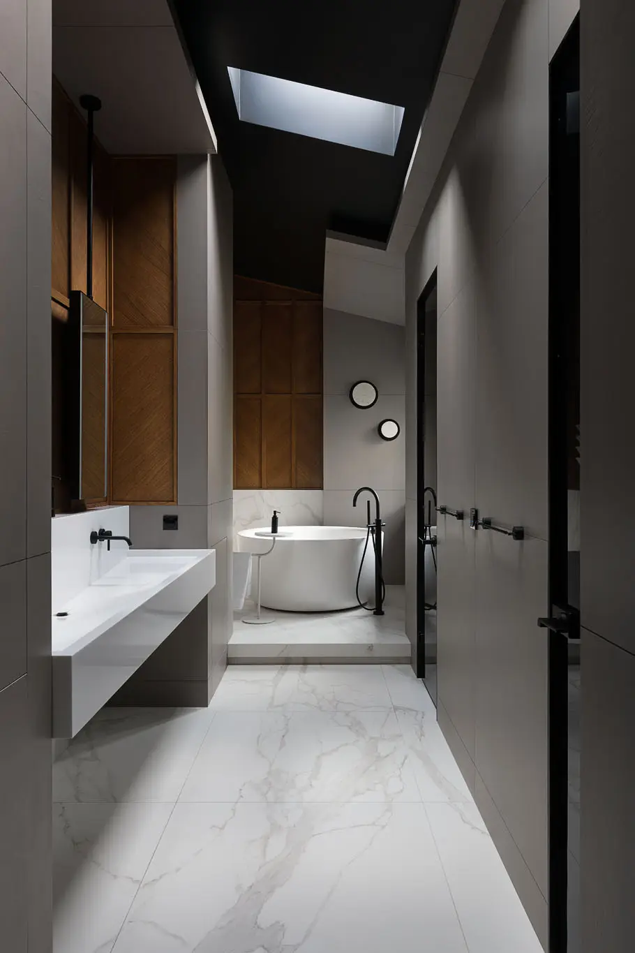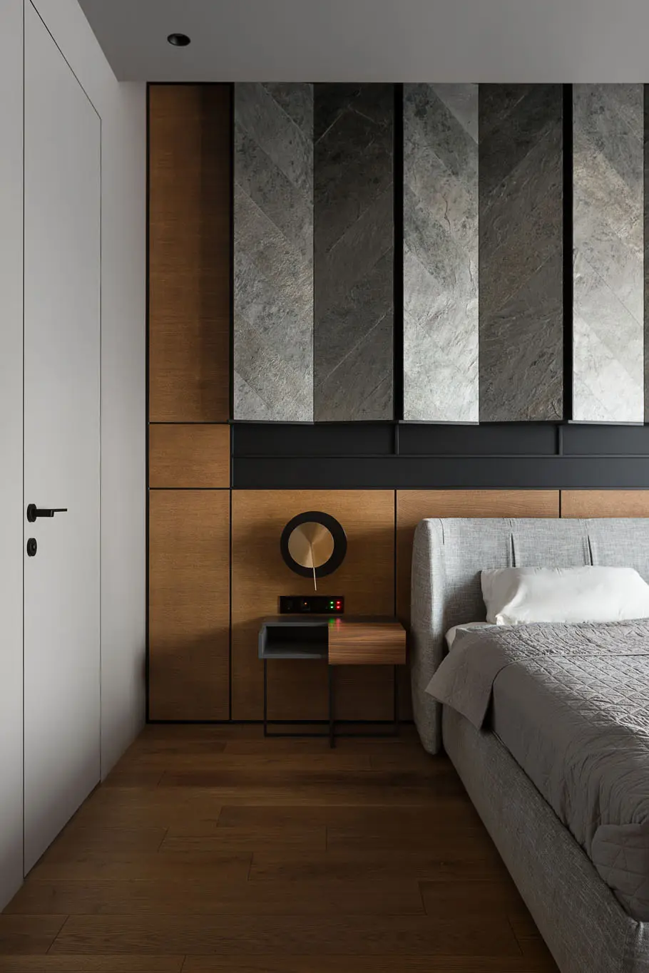 Villa privada de una sola planta en medio del bosque. Pizarra natural, roble y tonos de grafito entrelazados en este interior