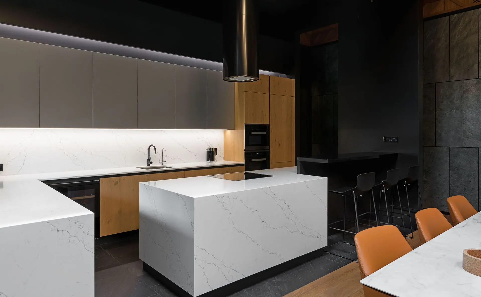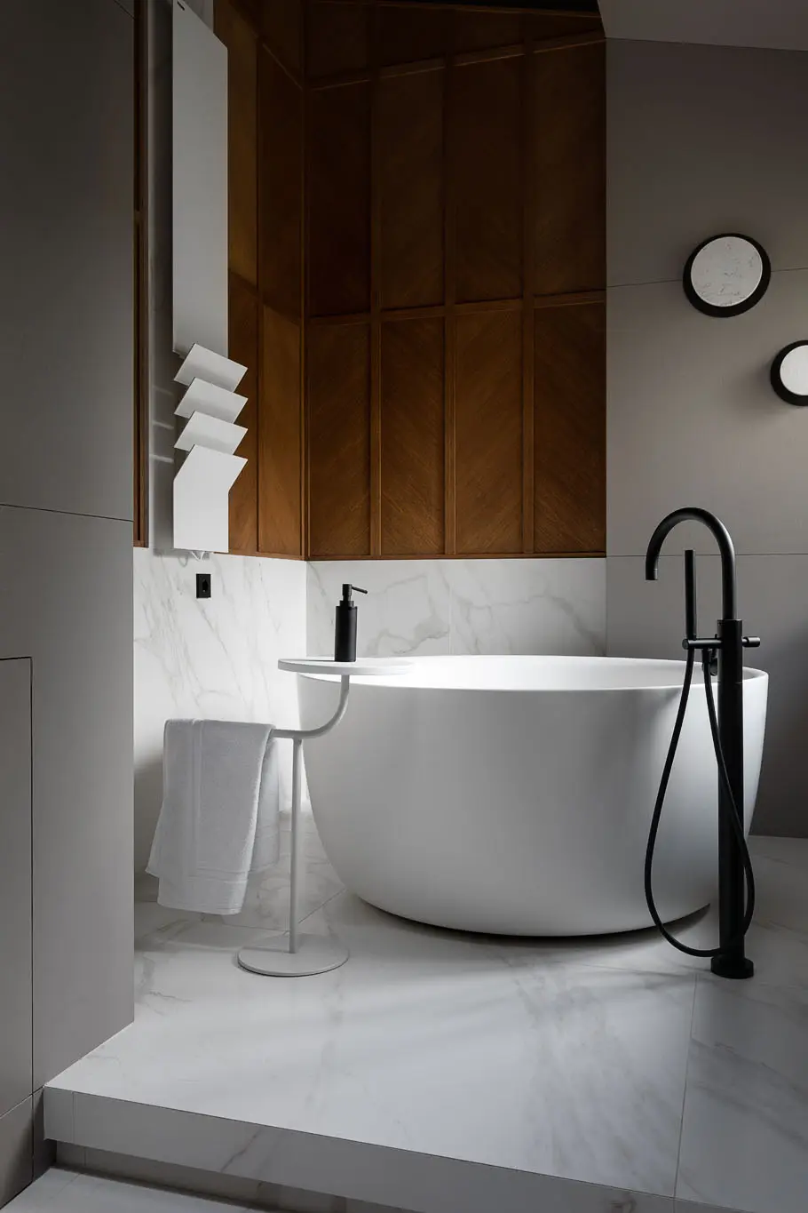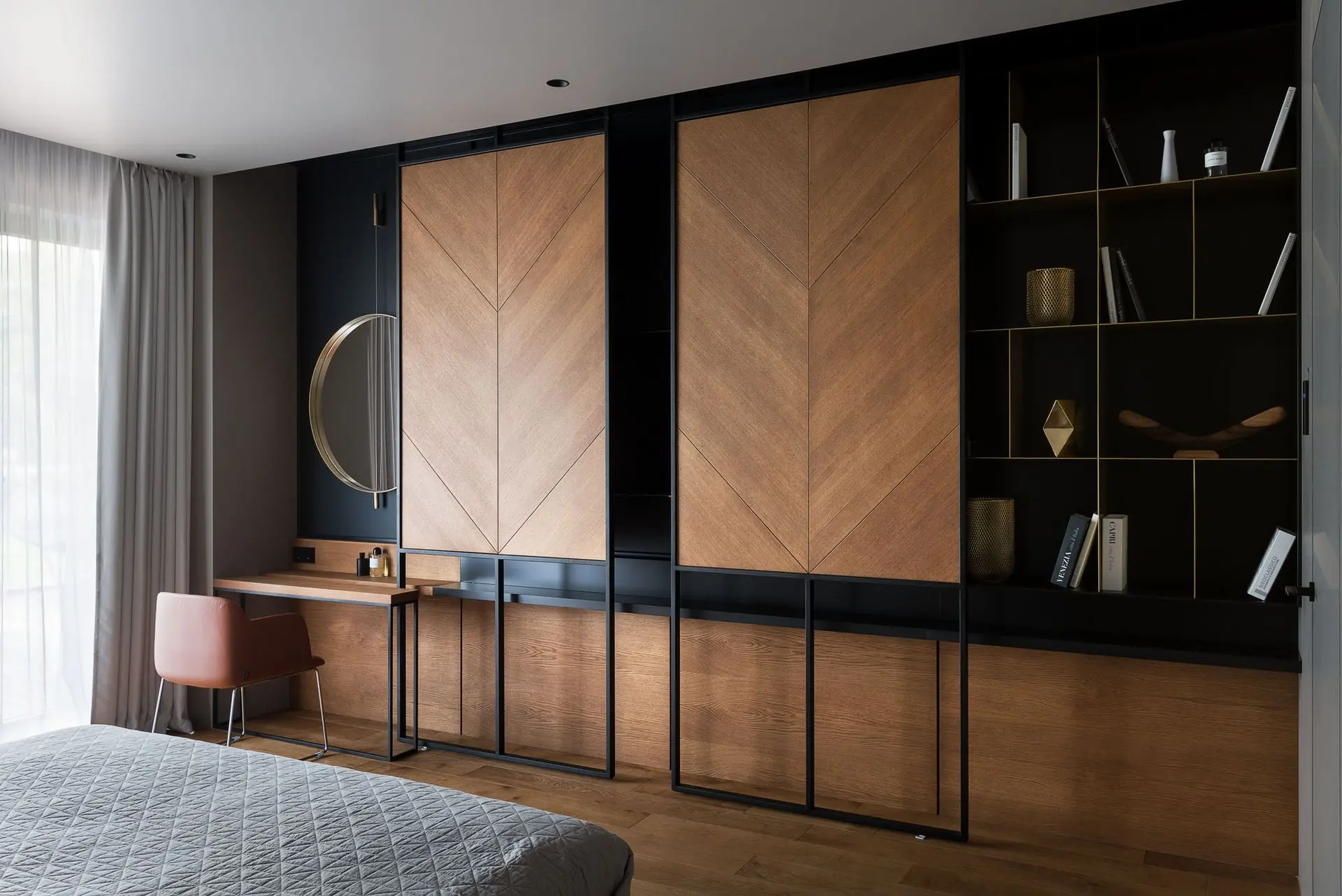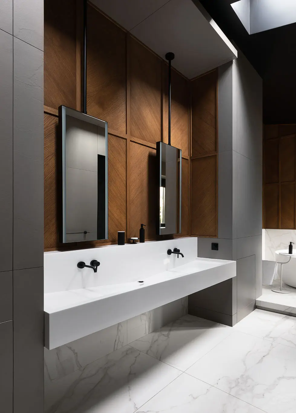Villa privada de una sola planta en medio del bosque. Pizarra natural, roble y tonos de grafito entrelazados en este interior